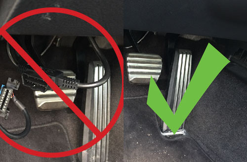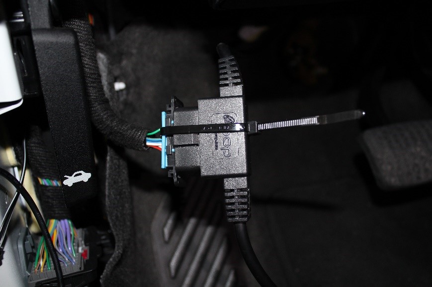 4. Coil and zip tie the cable neatly and tuck to the side behind a panel or zip tie to the side to ensure it is not visible in the foot well and completely clear of the emergency brake, foot pedals and steering column!